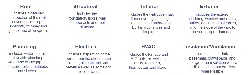 The intent is to provide you with all information concerning the real condition of the home so that you are aware of any issues, and enable you to take care of any findings on your own, such as determining whether to proceed with the purchase of the home is prudent, or perhaps use the information from the inspection to negotiate the terms of your purchase. A general home inspection includes a visual examination of the following components: